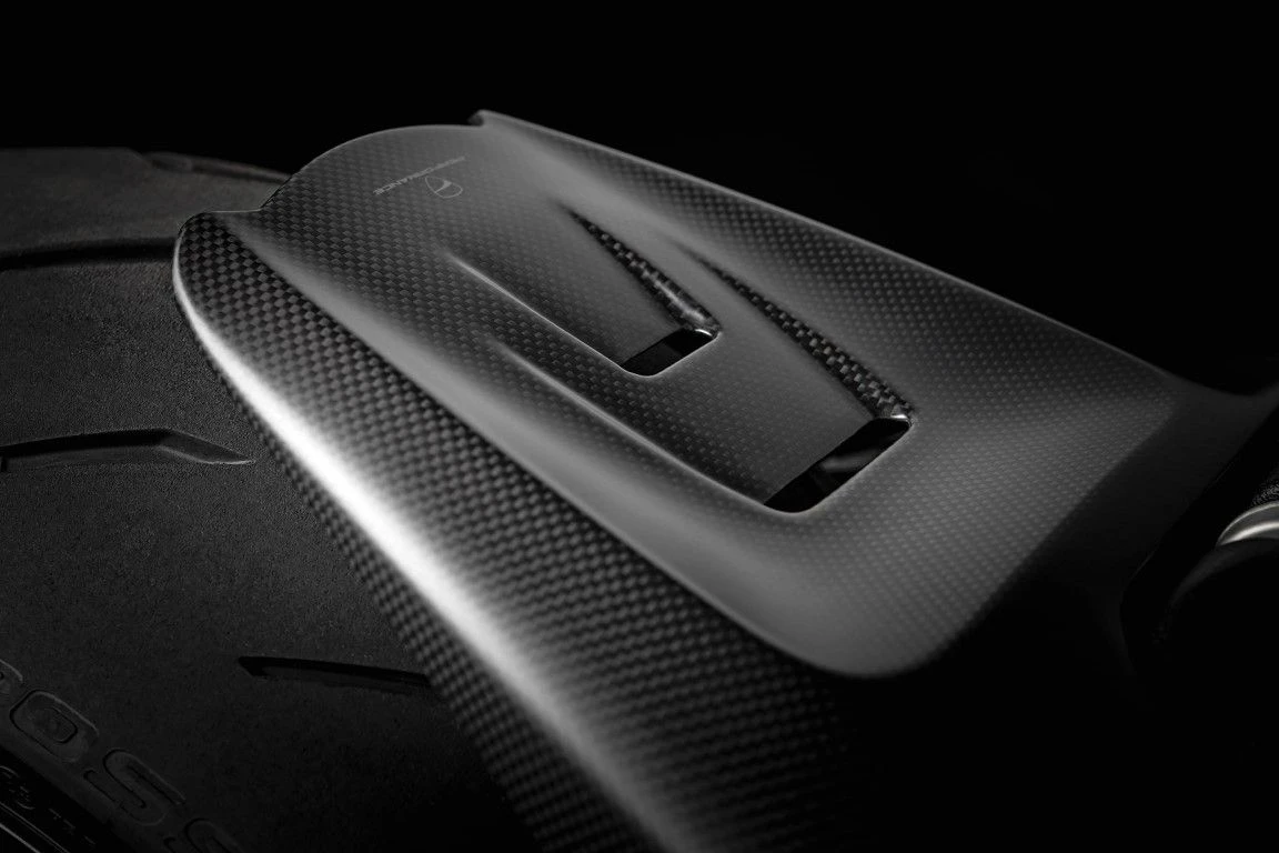 Kostbare details in koolstofvezel, die niet alleen uitstekende bescherming bieden, maar ook lichtheid geven en het verfijnde uiterlijk van de achterkant van de Diavel verfraaien.