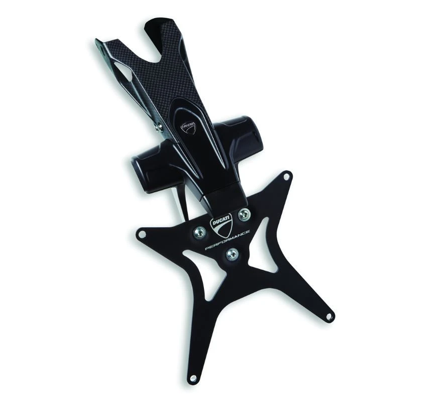 Deze Ducati kentekenplaathouder is gemaakt van carbon en geeft de achterkant van de Panigale V4 een agressieve uitstraling. De kentekenplaathouder is gemaakt van carbon en is, bij gebruik van de motor op een circuit gemakkelijk te verwijderen.